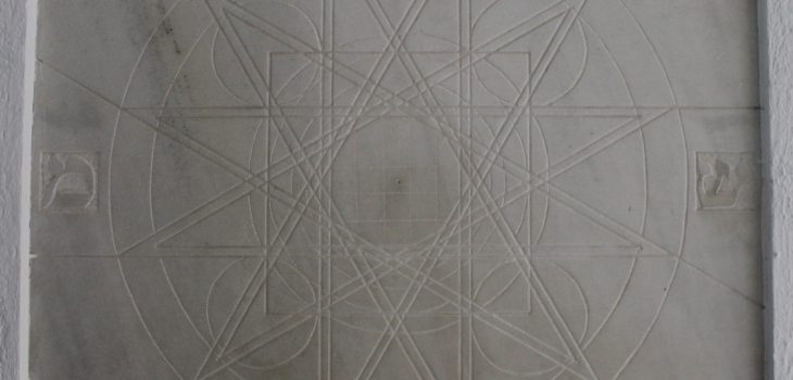 (…) En la lápida de mármol blanco, ocupando toda su superficie, la remota mano del marmolista Remigio Cobo había tallado una serie de círculos concéntricos que partían de un ajedrezado central. Cortando los círculos, el fino cincel había trazado una estrella de doce puntas. El conjunto formaba un entramado geométrico de líneas rectas y curvas que contrastaba con la vacía lisura de los márgenes en los cuales se distinguían tres solitarias letras hebreas, una arriba y dos a los lados, las tres letras madres de la cábala. (…)